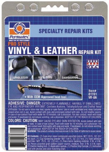 Permatex Ultra Series Vinyl and Leather Repair Kit clamshell is a complete professional kit with plug-in electric heat iron to make pro-style repairs. This kit contains: professional electric heat tool, 7 color compounds, clear vinyl adhesive and filler, grain pattern paper, metal spatula, and plastic dashboard hardening powder. Make virtually invisible repairs to upholstery, seats, dashboards, etc. for auto, home, and marine applications with Permatex’ repair kits.